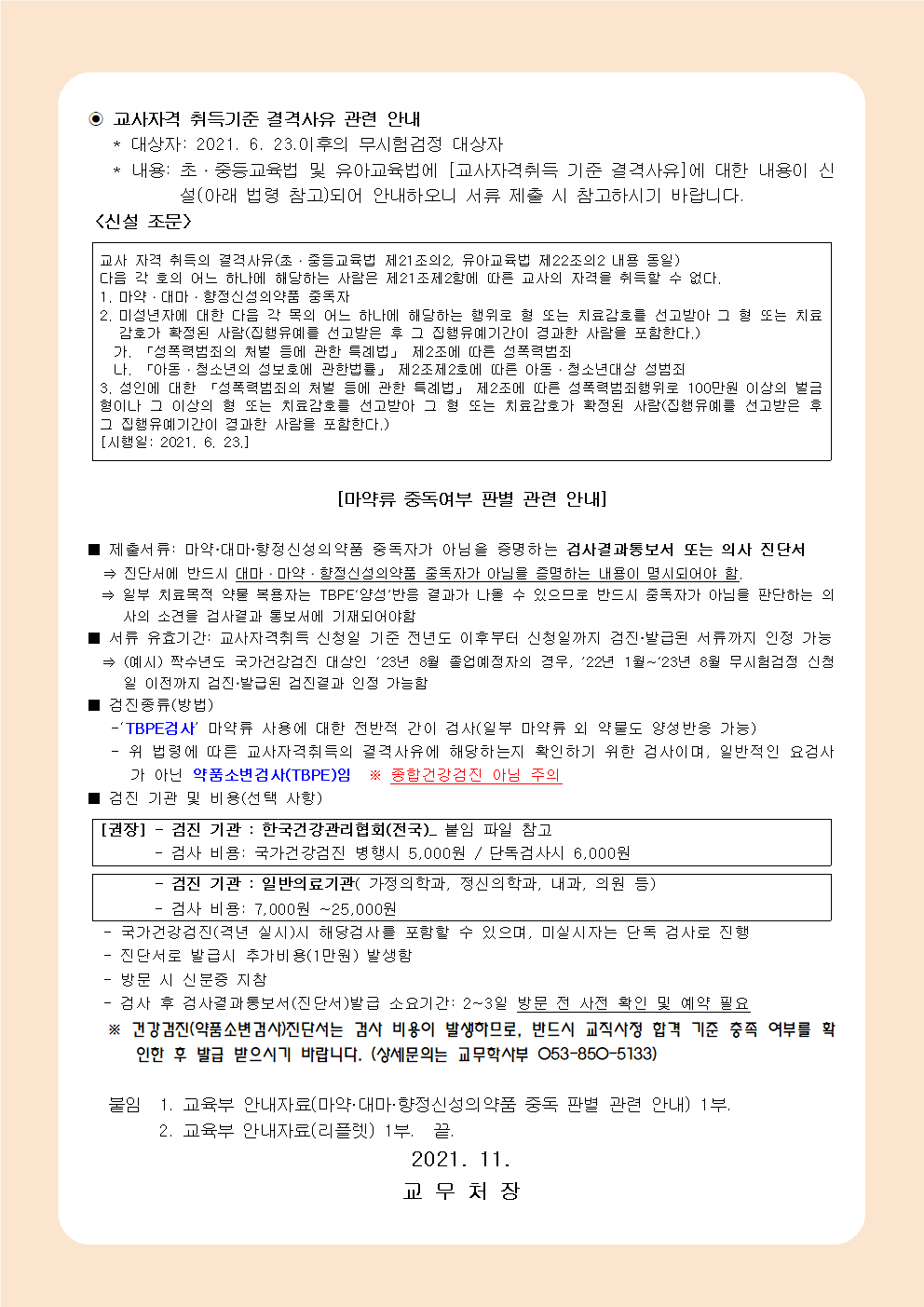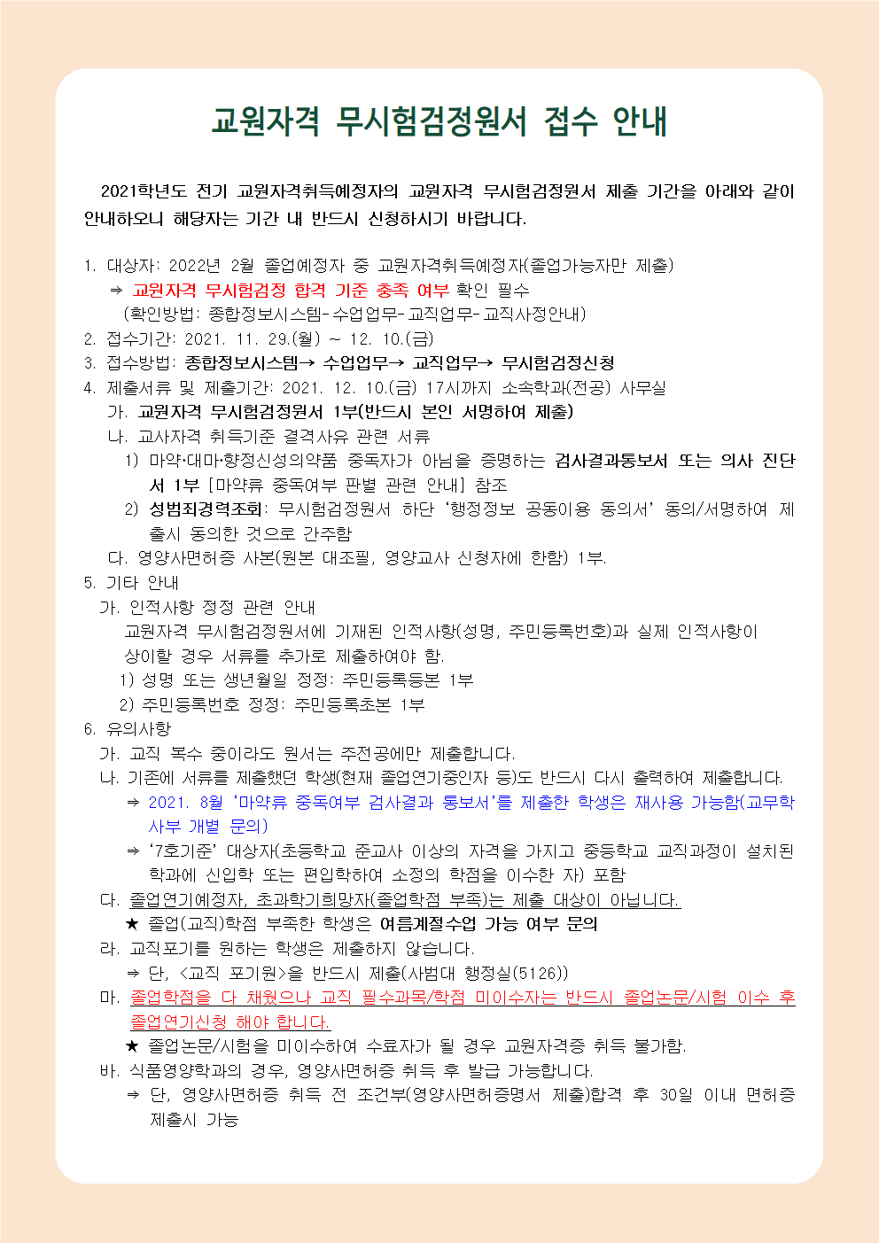 2021학년도 전기 교원자격 무시험검정원서 제출 안내