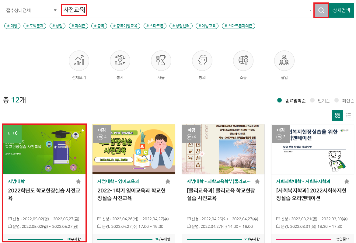대구대학교 비교과통합관리시스템(https://heart.daegu.ac.kr) 접속 → 상단 우측 돋보기(검색) 클릭 → '사전교육' → 검색
