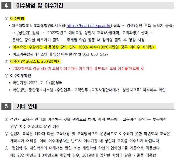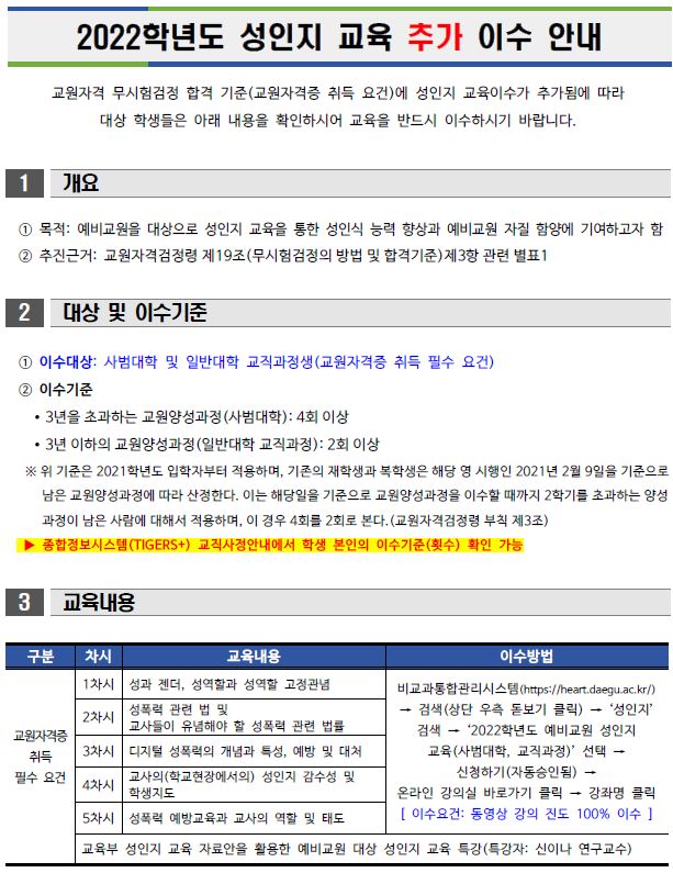 2022학년도 예비교원 대상 성인지 교육을 실시하였으나, 미이수자가 있어 아래와 같이 추가 이수기간을 운영하오니