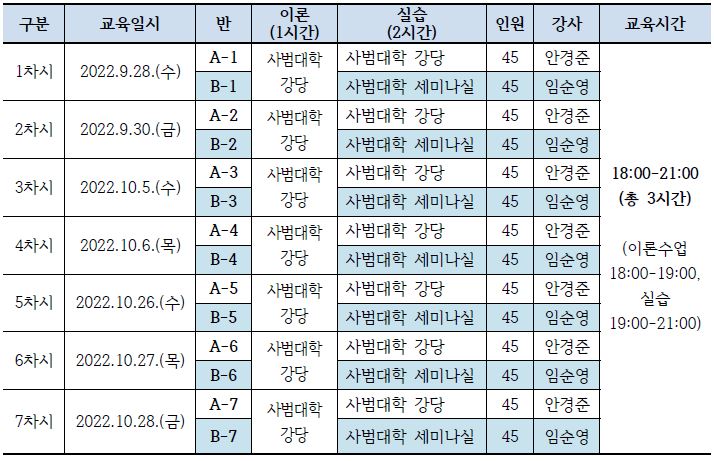 ※ 이론수업은 사범대학 강당에서 교육일자별 합반 진행 후 실습은 각 해당 강의실에서 진행