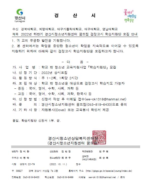경산시청소년지원센터에서 꿈드림 검정고시 학습지원단을 아래와 같이 모집하오니 교육봉사활동을 희망하는 학생은 첨부된