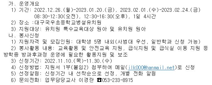 대구국우초등학교병설유치원(대구 북구 국우동)에서 2022학년도 겨울방학 중 방과후과정 교육봉사자를 모집하오니 신청 희망자는