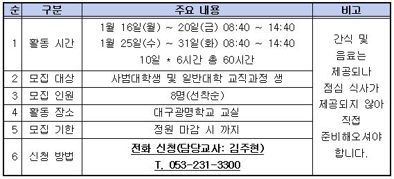 2022학년도 대구광명학교(대구 남구 대명동) 겨울 계절학교 교육봉사자를 아래와 같이 모집하오니 신청희망자는 내용을 확인하기 바랍니다.