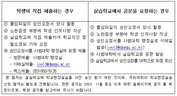 ※ 실습 희망 학교 담당자와 통화 후, 사범대학 행정실(053-850-5126)으로 전화 연락