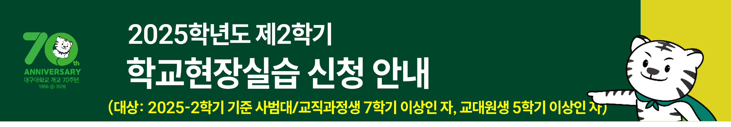 Email 문의: teaching@daegu.ac.kr 유선문의는 상담, 교직 업무처리 및 문의에 대한 회신으로 통화가 어려운 경우가 많습니다. 아래 형식에 맞춰 이메일로 우선 문의 해주세요~ <메일 제목> 2025-2 학교현장실습관련 문의 <메일 내용> 정확한 상담을 위해 학번(8자리 전체), 학과, 이름, 실습학교명 기재 후 관련문의 작성 기 안내된 내용에 대한 재문의는 회신하지 않습니다. |